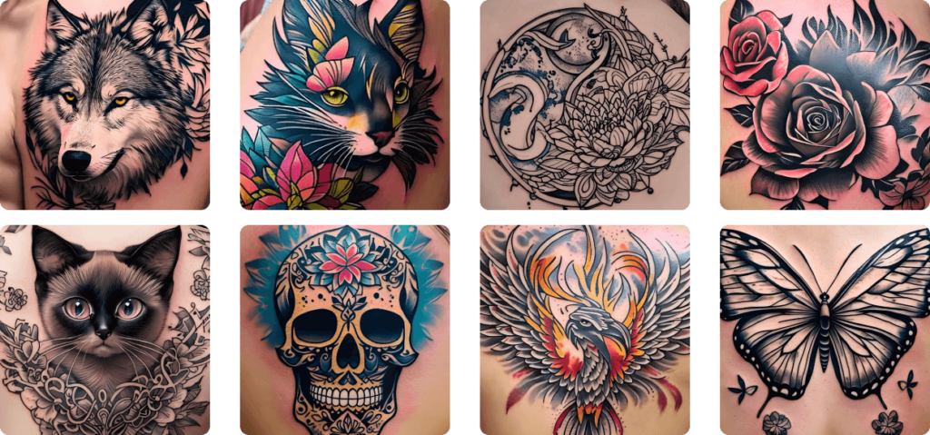 Acabe com a cansativa busca por designs de tatuagem – a Artguru tem a solução para você! Em apenas segundos, explore uma ampla variedade de designs únicos, desde flores delicadas e animais cativantes até símbolos poderosos e tatuagens com texto significativo. Seja qual for a parte do corpo em que você imagina um design de tatuagem – mãos, pescoço, costas ou outro lugar – o gerador de tatuagens com inteligência artificial da Artguru tem algo para todos.