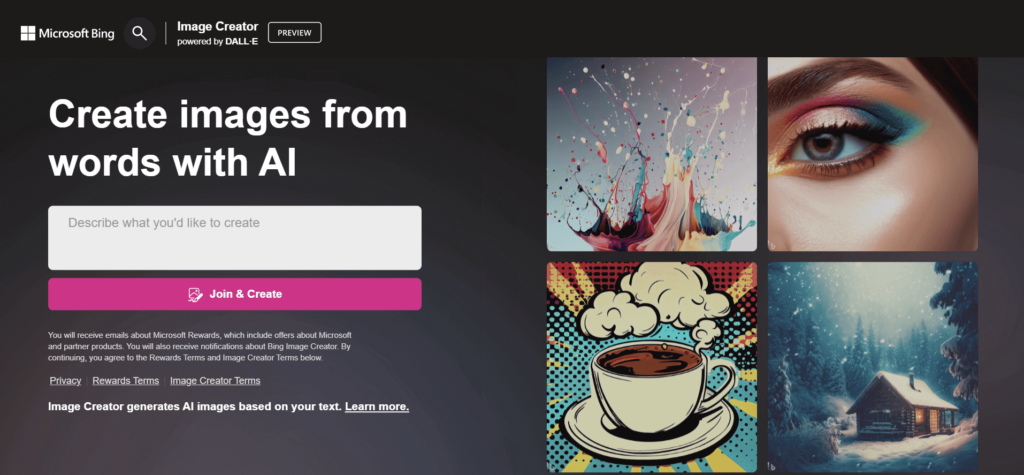Backed up by Microsoft Bing and powered by DALL·E, Bing Image Creator utilizes deep learning algorithms to analyze millions of images and create unique artwork from scratch. Specifically, it uses a combination of convolutional neural networks (CNNs) and generative adversarial networks (GANs) to generate visually appealing images.