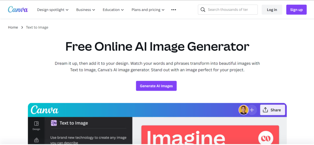 Apart from the design tool, Canva established a new feature called Canva AI Image Generator, which uses artificial intelligence to create stunning visuals. The tool is designed to simplify your design process and make it more accessible to everyone, regardless of design skills. With it, you can create various graphics, including logos, social media posts, business cards, and more.