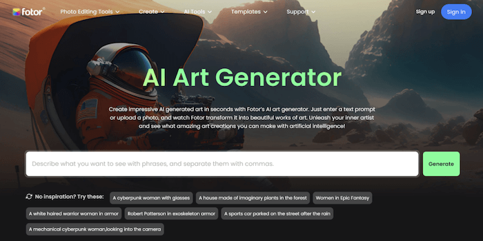 Exactly the same as it sounds, Fotor AI Art Generator is an online tool, capable of transforming photos into stunning artworks using AI algorithms. It can identify the objects, colors, and patterns in photos and then applies the algorithms to generate a new image that resembles a piece of art. This tool also has a collection of pre-set styles to choose from, allowing you to preview the artwork before finalizing it.