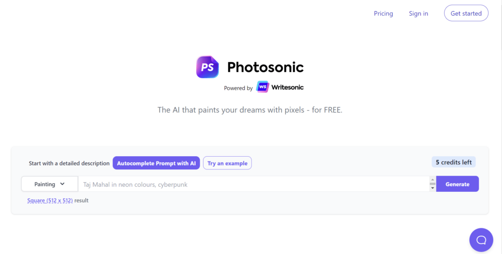 - Free plan: up to 5 images/month, with a resolution of up to 512×512 pixels.