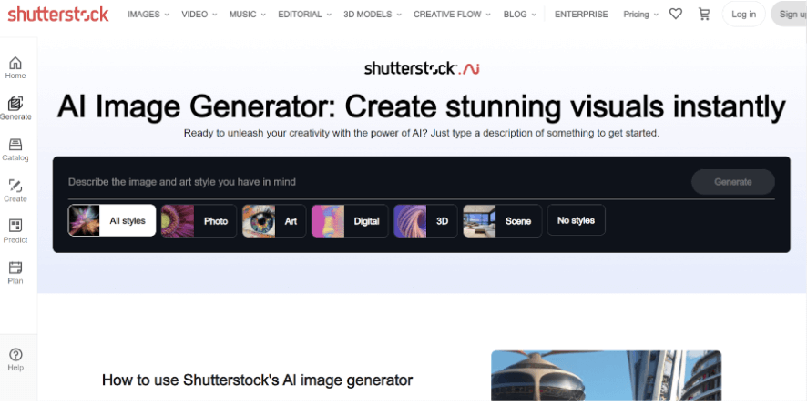 As we all know, Shutterstock is renowned for high-quality images. Its latest feature of it is called Shutterstock AI Image Generator. This platform has an algorithm that can analyze millions of images to identify patterns and styles and then creates new images based on this analysis. All it takes is to type in the keywords or describe the images you wanted to generate, and it will produce one for you.